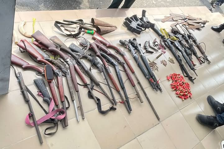 Items recovered during the exercise include an Expanded General Purpose Machine Gun (GPMG), AK-47 ammunition, a pistol, several locally fabricated rifles with cartridges, and cutlasses. Police authorities said the weapons are being processed in line with standard procedures.