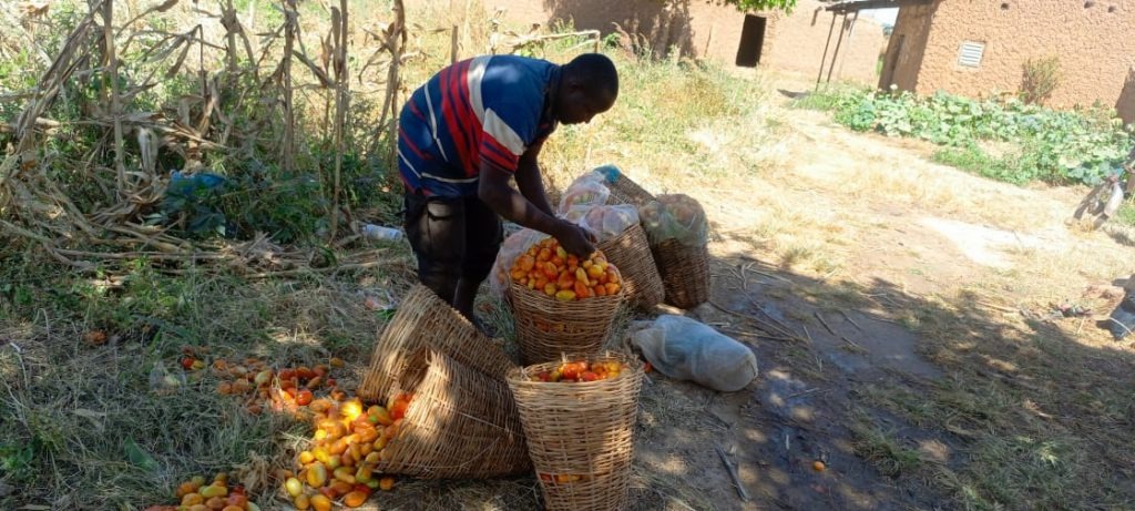 Malam Lawan picking tomatoes in his farm. Credit: Aminu Adamu