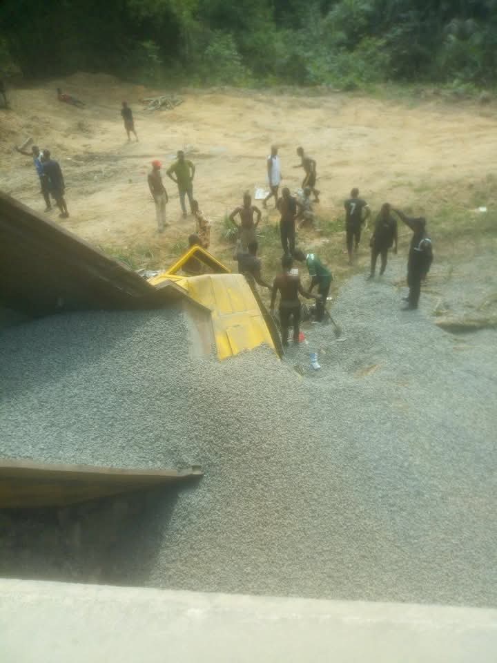 According to an eyewitness identified as Alamtung, “the truck had attempted to avoid a deep pothole when it tilted and collapsed sideways, landing partly and pouring gravel on the bus. Although no fatalities were confirmed, passengers sustained injuries and the vehicle was severely damaged.”