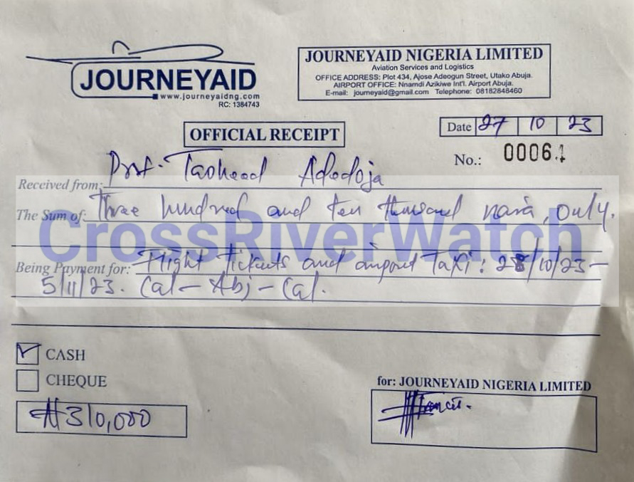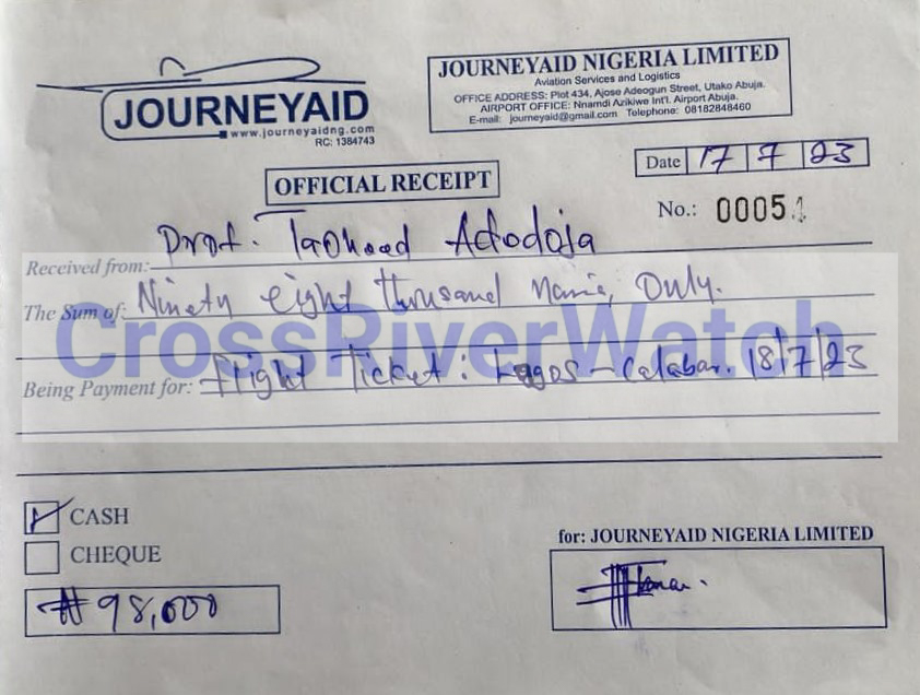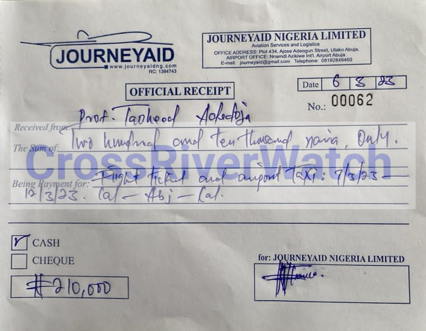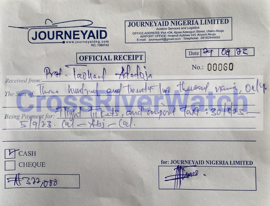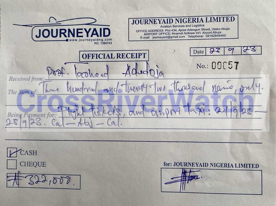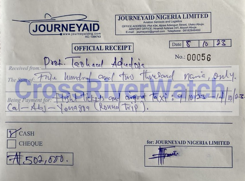 In some of the receipts and documents obtained and probed by CrossRiverwatch, it is either the receipts or ticket numbers, time, or date is altered. The serial numbers and dates of the documents – JourneyAid Nigeria Limited (often used), you would see that the receipts or invoices are fraudulently made and filled just to suck the Institute’s funds.