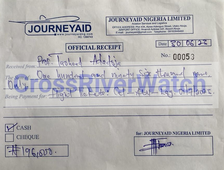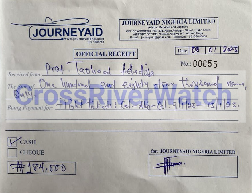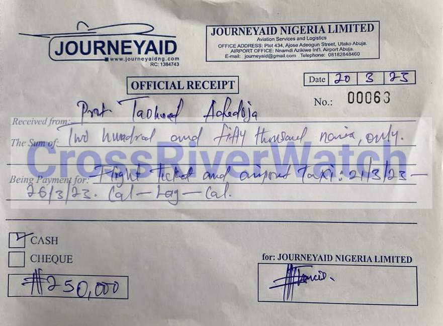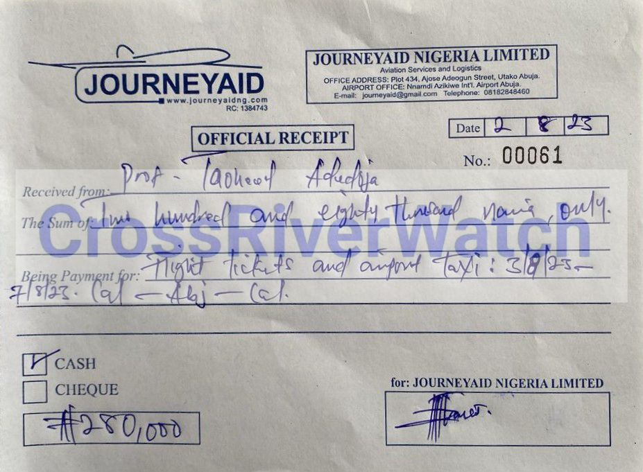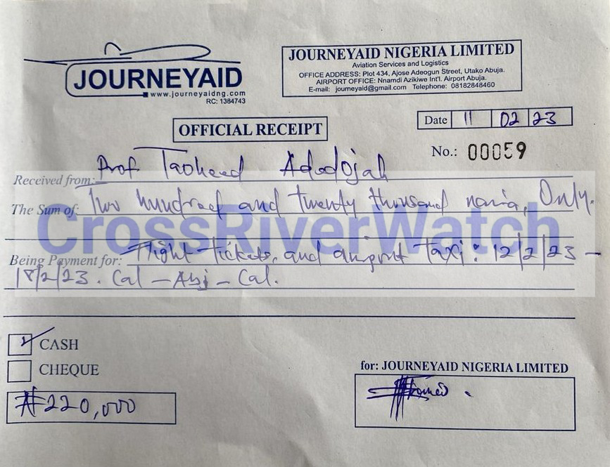 In some of the receipts and documents obtained and probed by CrossRiverwatch, it is either the receipts or ticket numbers, time, or date is altered. The serial numbers and dates of the documents – JourneyAid Nigeria Limited (often used), you would see that the receipts or invoices are fraudulently made and filled just to suck the Institute’s funds.